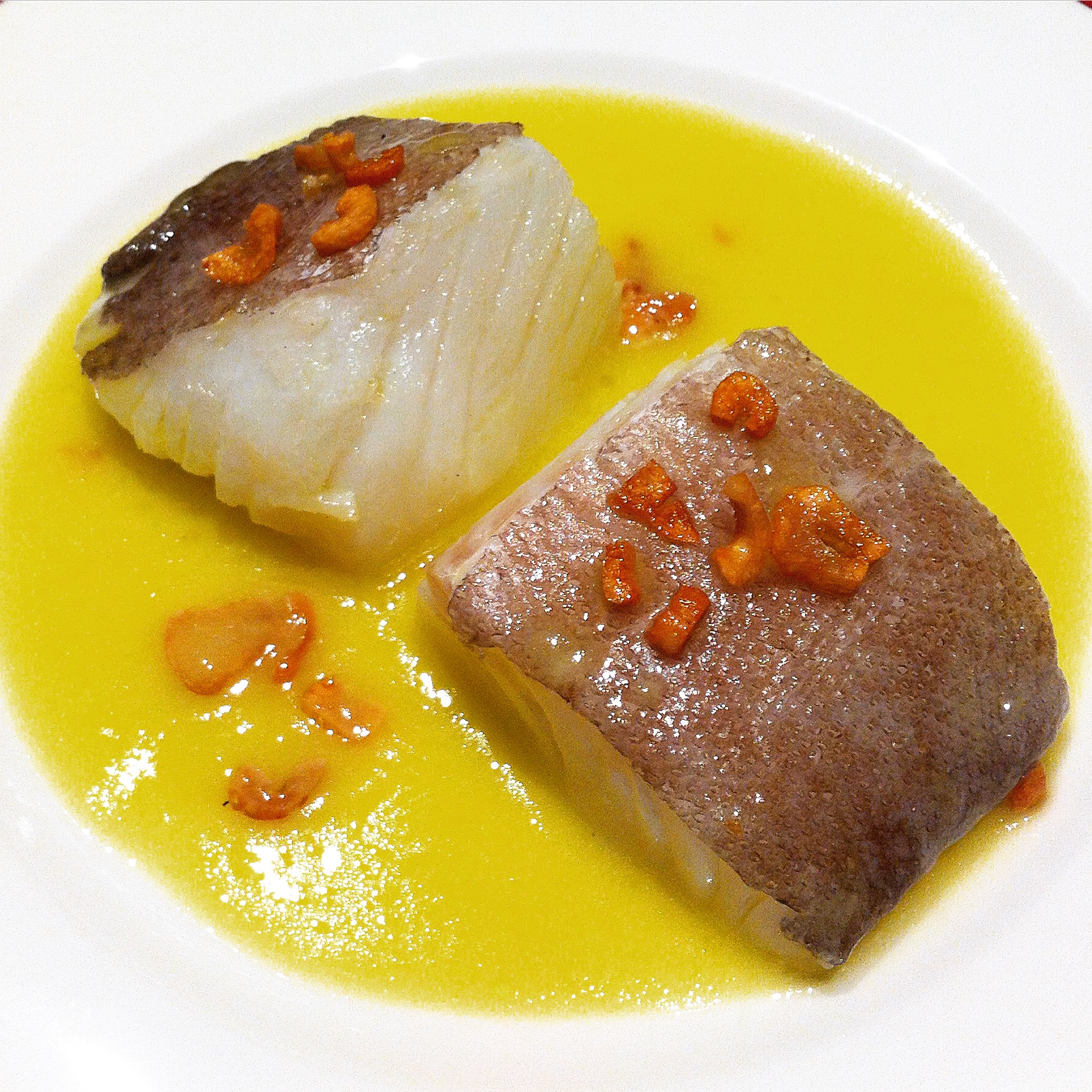 - Una vez templado ponemos de nuevo al fuego. Con los lomos de bacalao en el aceite de la cazuela (ya con la piel hacia abajo podemos trabajar mejor y no se deshace), se empieza a mover en sentido circular con energía.